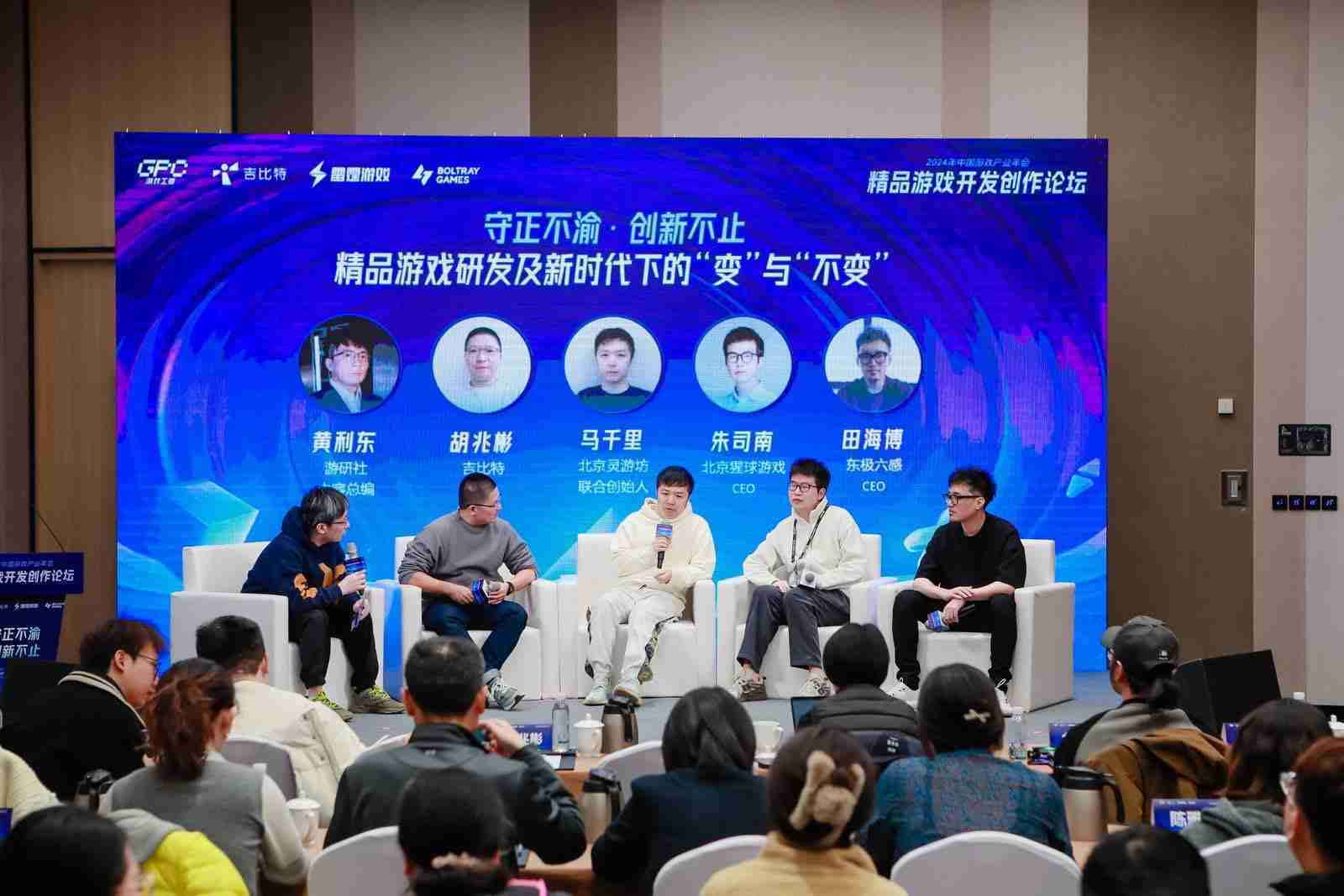 圆桌对话环节,,,在游研社内容总编黄利东的主持下,,,JIUYOU.COMCTO胡兆彬、、、、北京灵游坊联合创始人马千里、、、、北京猩球游戏CEO朱司南、、东极六感CEO田海博等四位嘉宾围绕“守正不渝、、、创新不止——精品游戏研发及新时代下的‘变’与‘不变’”这一主题分享了各自在精品游戏开发理念及工程能力搭建方面的见解和经历,,并就行业变化下游戏人需要坚守的理念等展开交流探讨。。