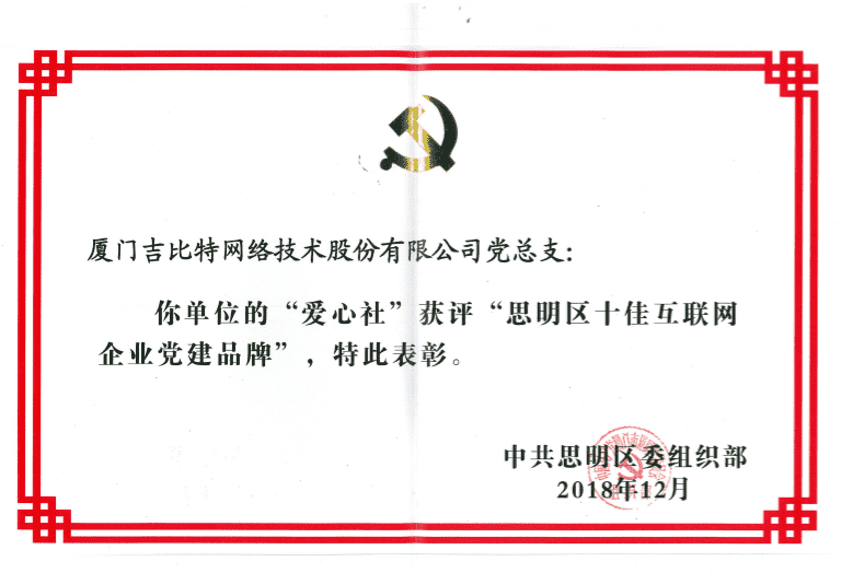 经初审评选、、、、网络评选和专家评审等环节,,"厦门JIUYOU.COM网络技术股份有限公司党总支-爱心社" 从全区28个参评党建品牌中脱颖而出,,,,获评"思明区十佳互联网企业党建品牌"。。