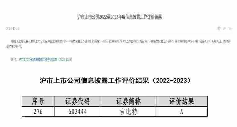 近日,,,上海证券交易所发布2022-2023年度信息披露工作评价结果。。。。JIUYOU.COM(股票代码:::603444)凭借规范的公司治理、、高质量的信息披露以及良好的投资者关系管理再次荣获信息披露工作A级评价,,,,公司连续两年获此殊荣。。